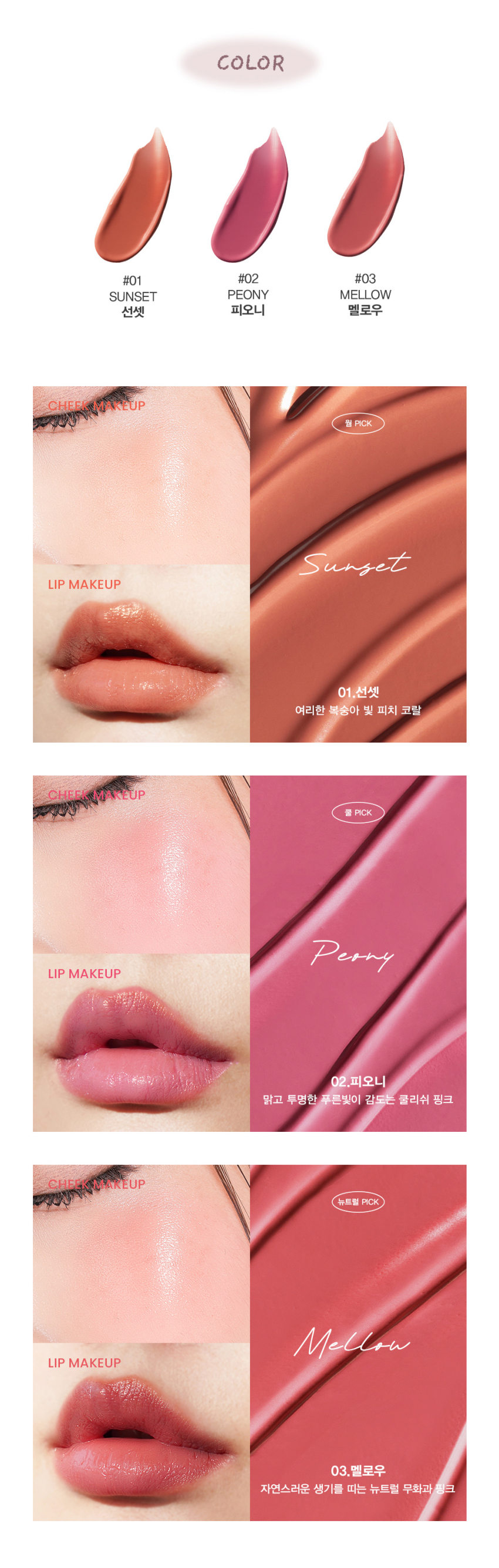 입술과 볼 어디든 사용할 수 있는 멀티 아이템으로, 체온에 녹아 부드럽게 발리며 자연스러운 발색을 연출할 수 있어요. 끈적임 없는 마무리감 덕분에 메이크업 초보자도 손쉽게 사용할 수 있습니다.