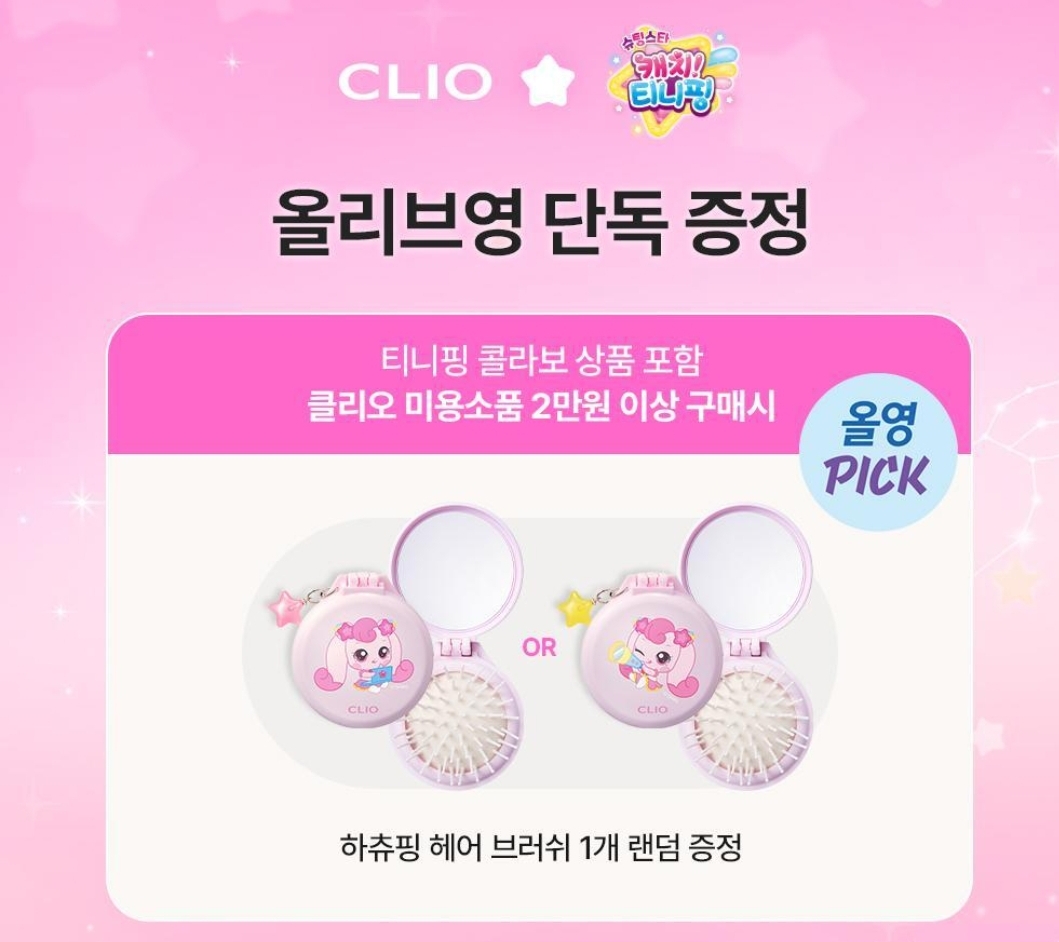증정 이벤트: 클리오 미용소품류 20,000원 이상 구매 시, 하츄핑 헤어 브러쉬 증정 (선착순 한정 수량)