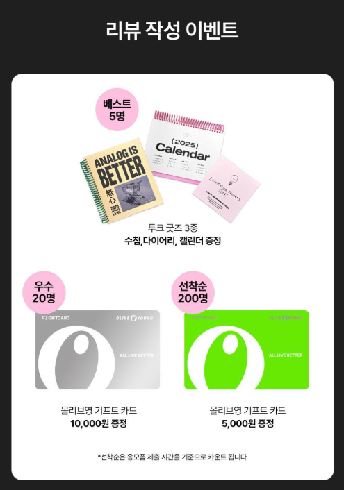 - 선착순 리뷰어 200명: 올리브영 기프트 카드 5,000원권
