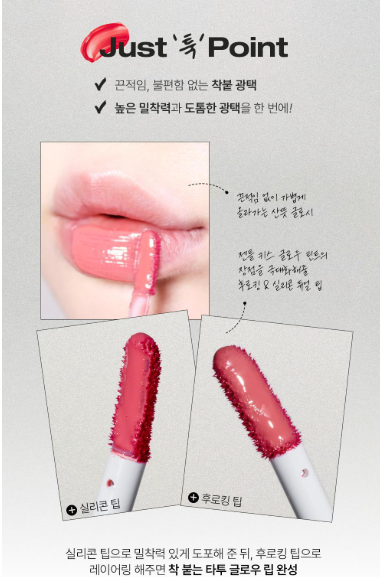 - 투웨이 팁 디자인 이 틴트는 후로킹 재질 팁과 실리콘 팁이 함께 있어, 밀착력과 광택감을 한 번에 살릴 수 있어요. 후로킹 팁으로 틴트를 얇게 펴 바른 후, 실리콘 팁으로 광택을 더하면 깔끔하고 지속력 높은 립 메이크업을 완성할 수 있습니다.