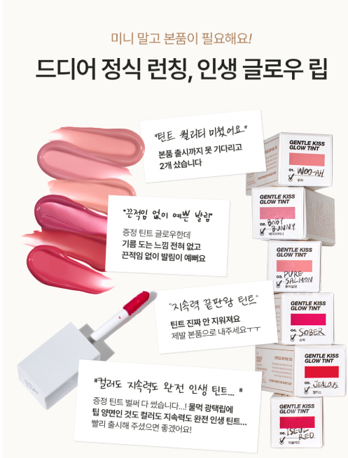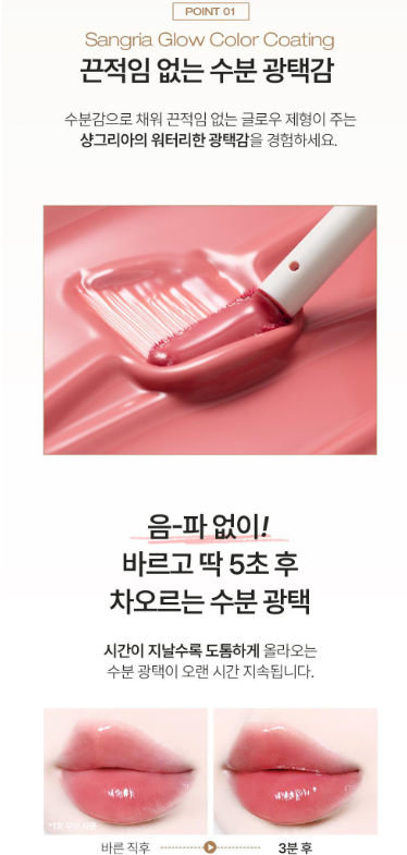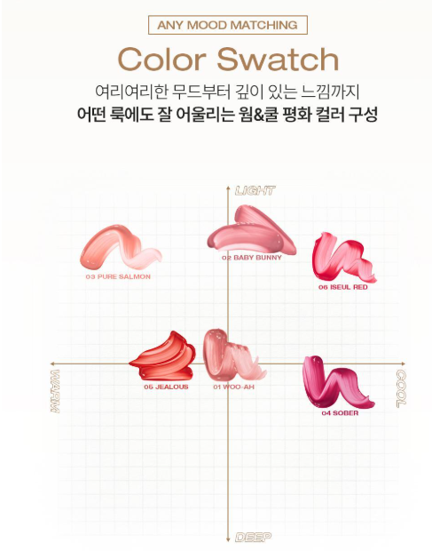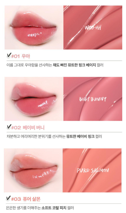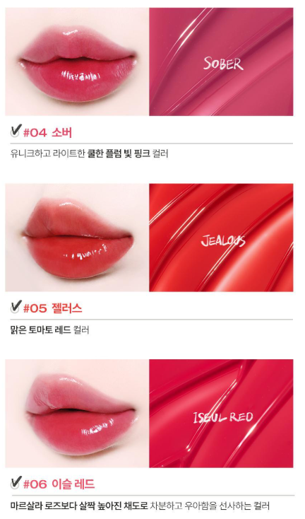 - 글로우와 컬러를 동시에: 바르는 즉시 맑고 선명한 발색을 제공하며, 시간이 지날수록 도톰해지는 광택감이 특징입니다.