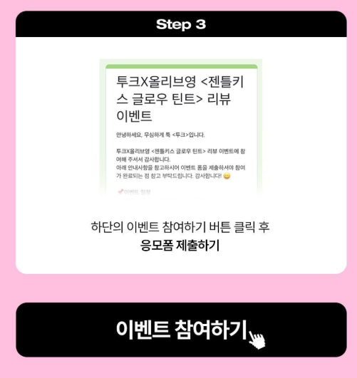 현재 올리브영에서는 투크 젠틀 키스 글로우 틴트 출시 기념으로 리뷰 작성 이벤트가 진행 중입니다! 이벤트에 참여하여 다양한 경품을 받을 수 있는 기회를 놓치지 마세요.