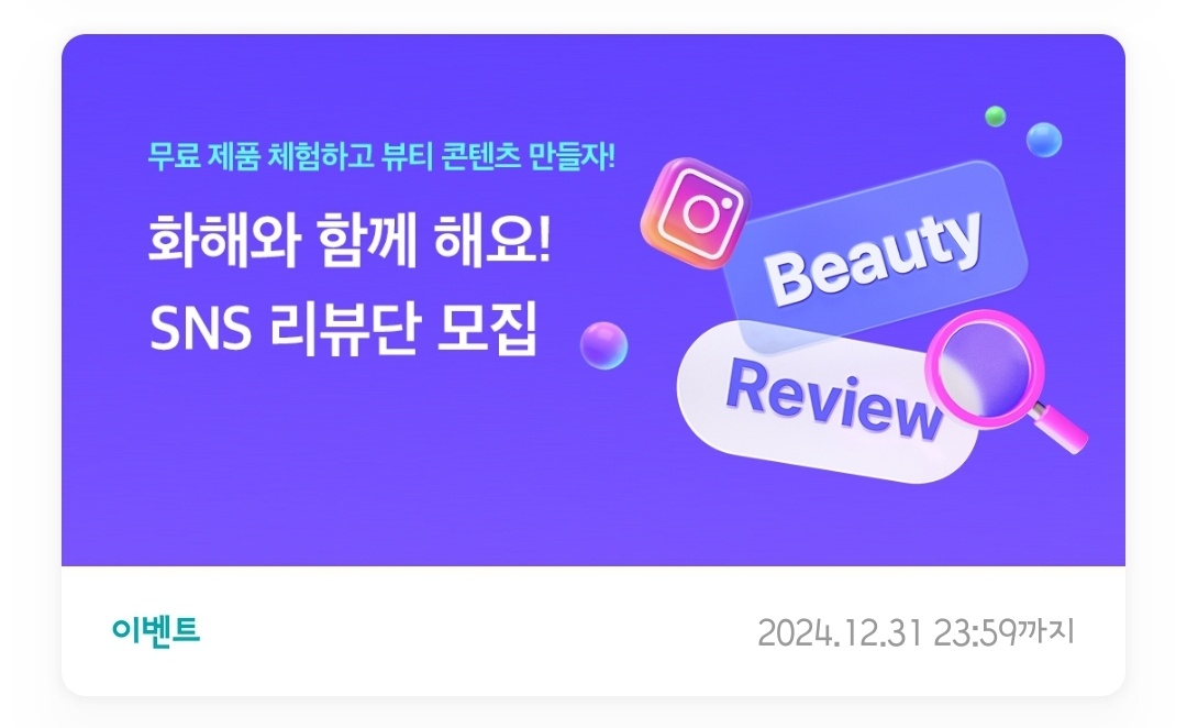 다양한 프로그램을 통해 화장품 체험 기회를 제공합니다. 특히 SNS 리뷰단은 독창적이고 창의적인 뷰티 콘텐츠를 제작하며 새로운 뷰티템을 소개할 수 있는 특별한 기회랍니다. 뷰티 콘텐츠 제작과 체험에 관심이 있다면, 화해 프로그램에 꾸준히 도전해보세요. 다음에도 더 유용한 정보로 돌아올게요. 감사합니다!