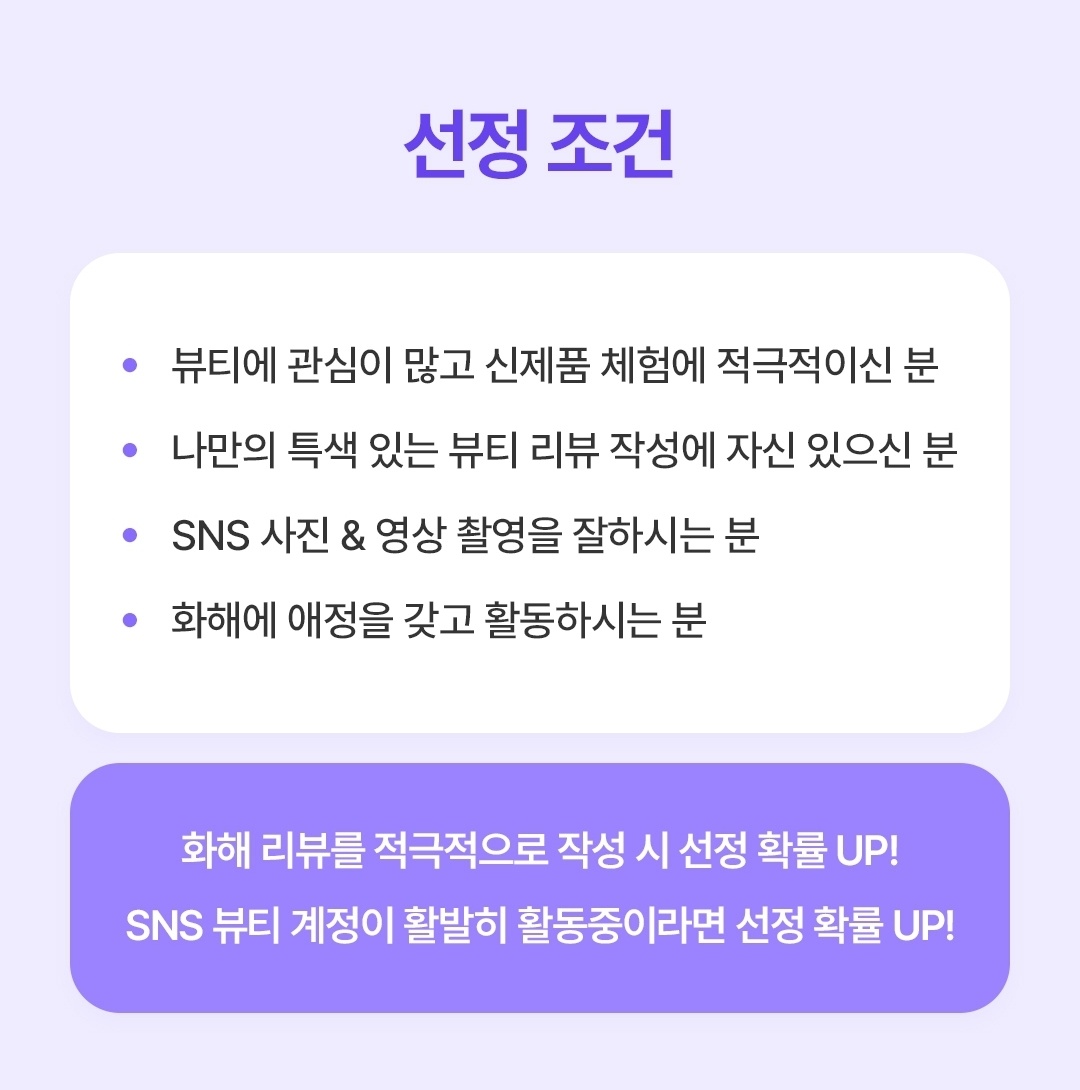 꾸준히 뷰티 콘텐츠를 제작하고 있다면 당첨 확률이 높아요. - 특색 있는 뷰티 리뷰 작성 능력